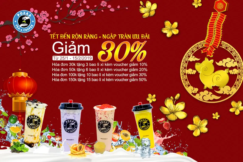 Nhân dịp Tết đến Xuân về, Pozaa Tea tiếp tục khuấy đảo thị trường trà sữa bằng chương trình khuyến mại cực chất nhằm tri ân khách hàng đã ủng hộ Pozaa Tea trong thời gian vừa qua. Với hy vọng mang lại một mùa xuân ngập tràn tiếng cười hạnh phúc trong không gian Pozaa Tea sang trọng, hiện đại sẽ giúp các tín đồ trà sữa quây quần ấm áp bên người thân, gia đình, bạn bè.